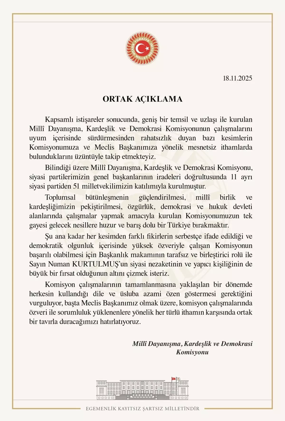“Kapsamlı istişareler sonucunda, geniş bir temsil ve uzlaşı ile kurulan Milli Dayanışma, Kardeşlik ve Demokrasi Komisyonunun çalışmalarını uyum içerisinde sürdürmesinden rahatsızlık duyan bazı kesimlerin Komisyonumuza ve Meclis Başkanımıza yönelik mesnetsiz ithamlarda bulunduklarını üzüntüyle takip etmekteyiz. Bilindiği üzere Milli Dayanışma, Kardeşlik ve Demokrasi Komisyonu, siyasi partilerimizin genel başkanlarının iradeleri doğrultusunda 11 ayrı siyasi partiden 51 milletvekilimizin katılımıyla kurulmuştur. Toplumsal bütünleşmenin güçlendirilmesi, milli birlik ve kardeşliğimizin pekiştirilmesi, özgürlük, demokrasi ve hukuk devleti alanlarında çalışmalar yapmak amacıyla kurulan Komisyonumuzun tek gayesi gelecek nesillere huzur ve barış dolu bir Türkiye bırakmaktır. Şu ana kadar her kesimden farklı fikirlerin serbestçe ifade edildiği ve demokratik olgunluk içerisinde yüksek özveriyle çalışan Komisyonun başarılı olabilmesi için Başkanlık makamının tarafsız ve birleştirici rolü ile Sayın Numan Kurtulmuş’un siyasi nezaketinin ve yapıcı kişiliğinin de büyük bir fırsat olduğunun altını çizmek isteriz. Komisyon çalışmalarının tamamlanmasına yaklaşılan bir dönemde herkesin kullandığı dile ve üsluba azami özen göstermesi gerektiğini vurguluyor, başta Meclis Başkanımız olmak üzere, komisyon çalışmalarında özveri ile sorumluluk yüklenenlere yönelik her türlü ithamın karşısında ortak bir tavırla duracağımızı hatırlatıyoruz.”