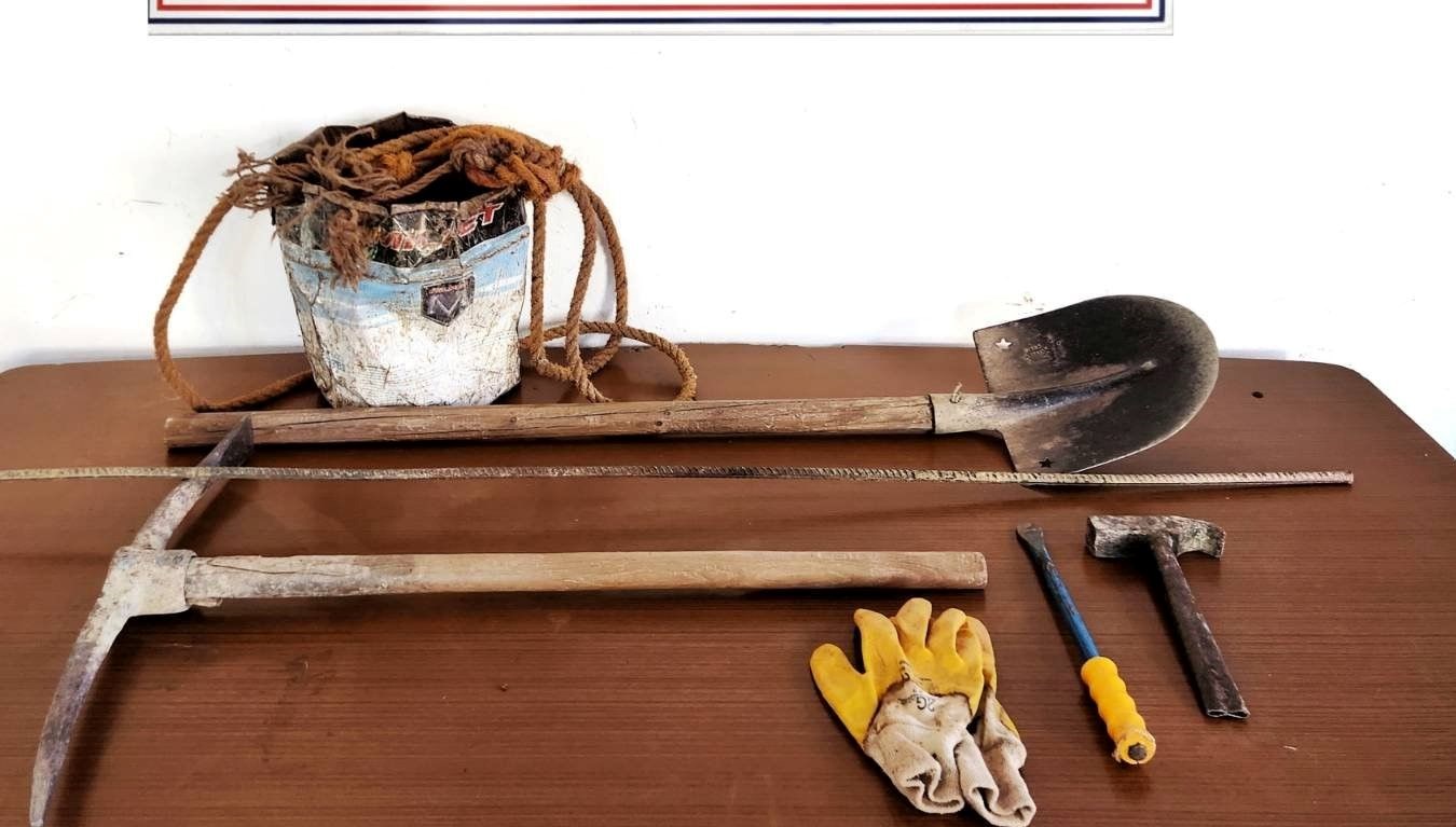 Şüphelilerle birlikte kaçak kazıda kullanılan kazma, kürek, murç, çekiç, kova, demir çubuk, eldiven ve yaklaşık 3 metre uzunluğunda ip ele geçirildi.