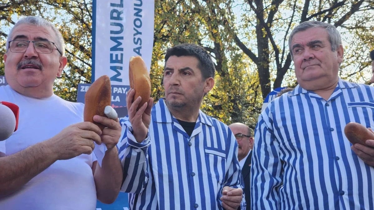 Devlet Memurları Konfederasyonu üyeleri, Türkiye Büyük Millet Meclisi önünde eylem yaparak dikkat çekti. Artan borçlar ve icra durumuyla karşı karşıya kalan memurları temsil eden konfederasyon üyeleri, “Bir canımız var, canımızı alacaksınız. Bir ceketim var sayın memurum. Al ceketimi al” diyerek protesto etti. Gömlek, kravat ve pantolonlarını çıkararak çizgili pijamalarıyla kaldılar.